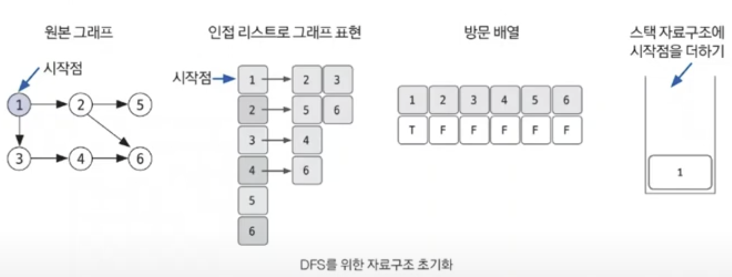 - DFS를 위해 필요한 초기 작업은 인접 리스트로 그래프 표현하기, 방문 배열 초기화하기, 시작 노드 스택에 삽입하기이다.